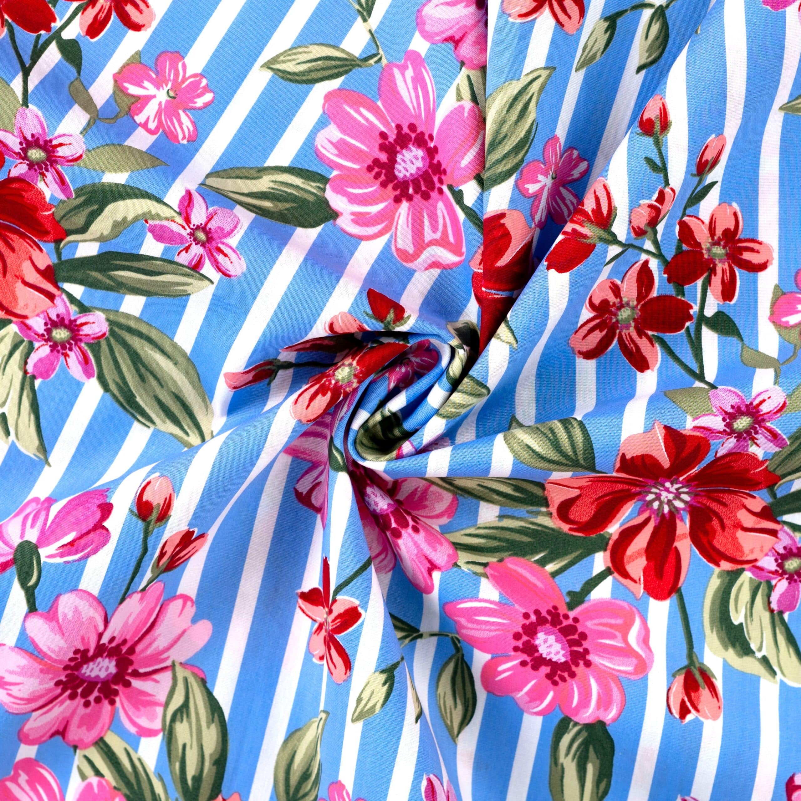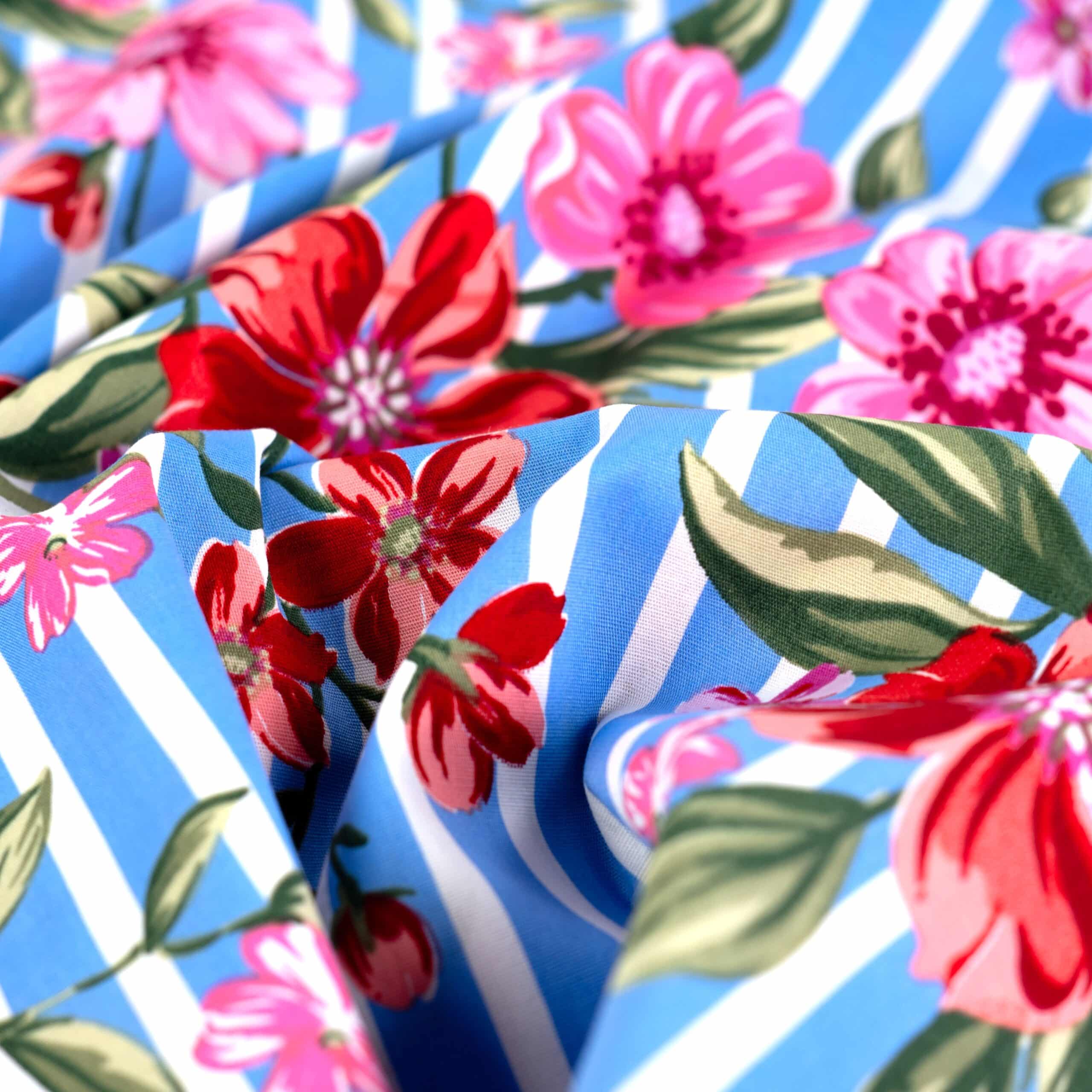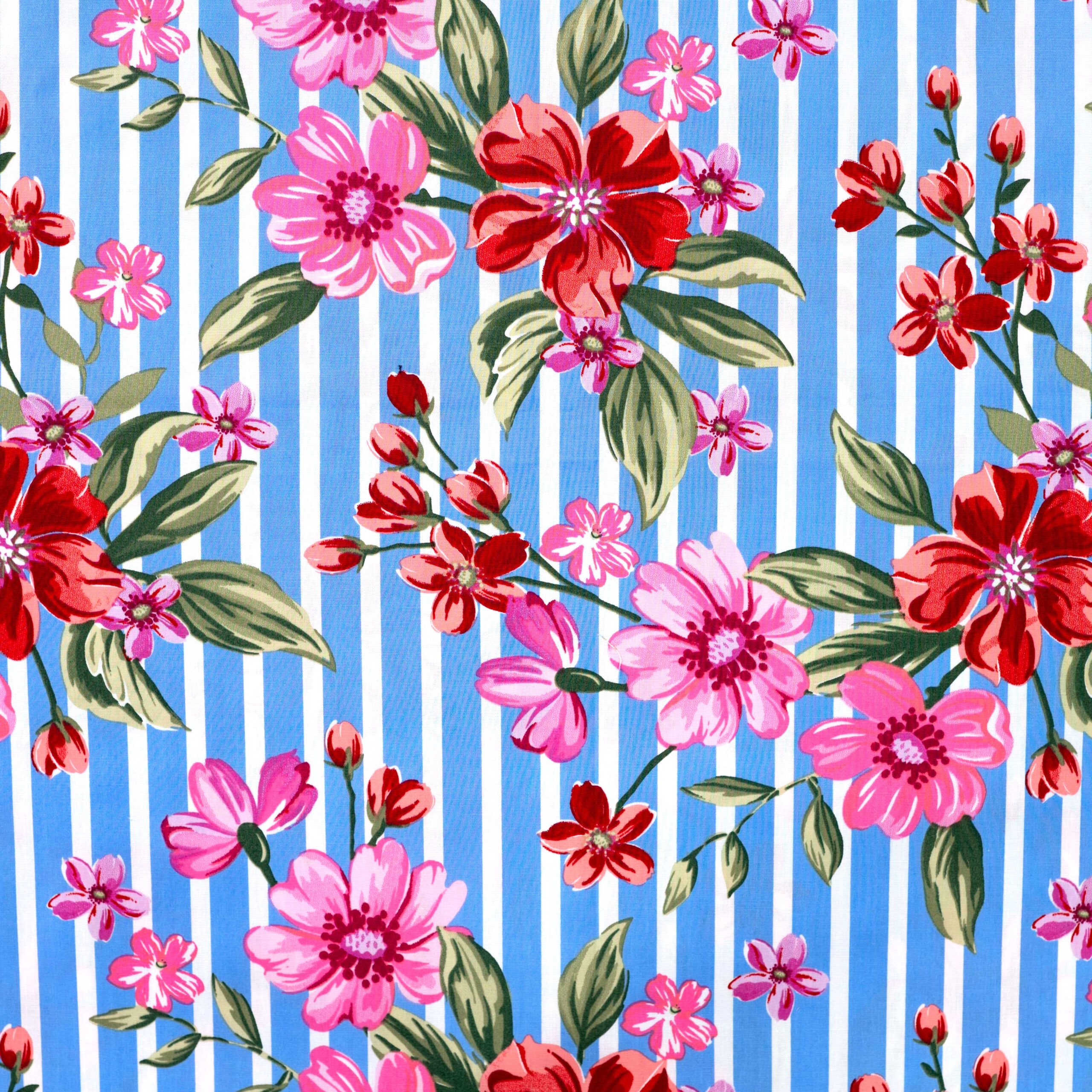 Wunderschöner Blumendruck auf Baumwollpopelin. Er hat 3% Elasthananteil daher ist er auch leicht strechig und eignet sich somit perfekt für Kleider, Röcke, Blusen, Tuniken und Hosen – aber auch als Deko.